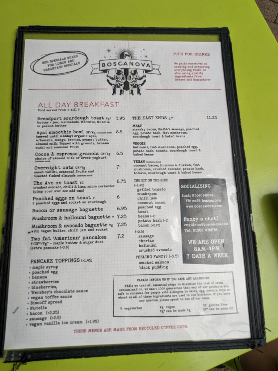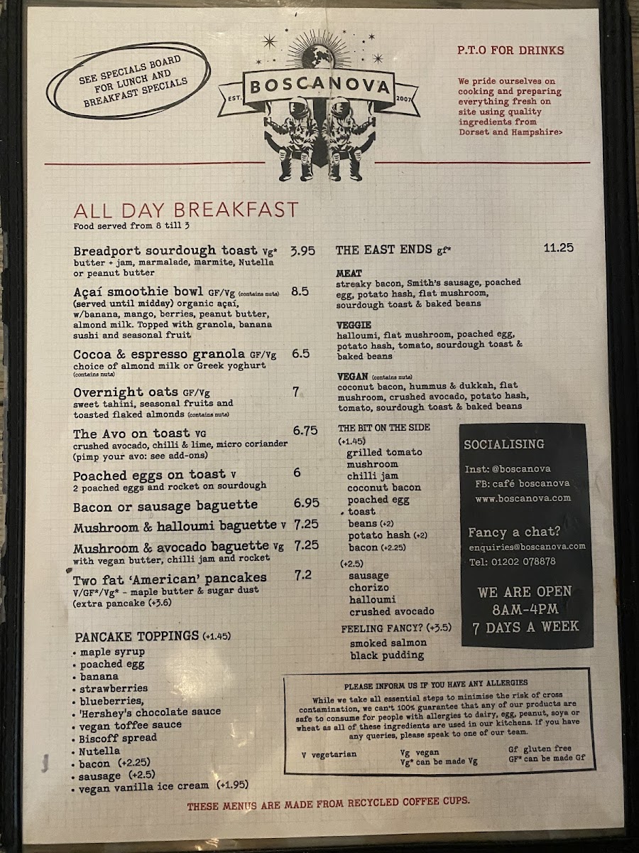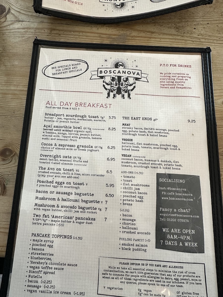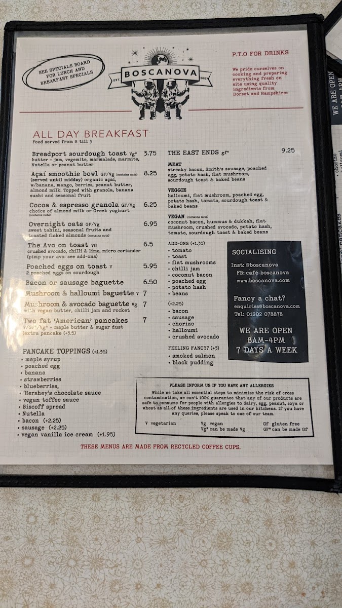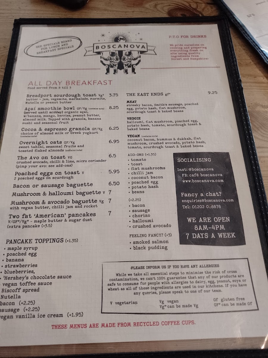 The menu at Cafe Boscanova Menu offers a delightful selection of dishes that are perfect for any time of the day. Nestled on Christchurch Rd in Boscombe, Bournemouth, this cozy spot is known for its laid-back atmosphere and vibrant flavors. Whether you're craving a light bite or a hearty meal, there's something for everyone. From expertly brewed coffee to freshly prepared breakfast options, each dish is crafted with care. The eclectic mix of flavors includes everything from vegan delights to classic favorites, ensuring that everyone can find a satisfying choice. And, of course, the atmosphere is just as inviting as the food - perfect for relaxing with a friend or catching up over a meal. The menu truly reflects the casual yet sophisticated spirit of Cafe Boscanova, making it a must-visit in the area.